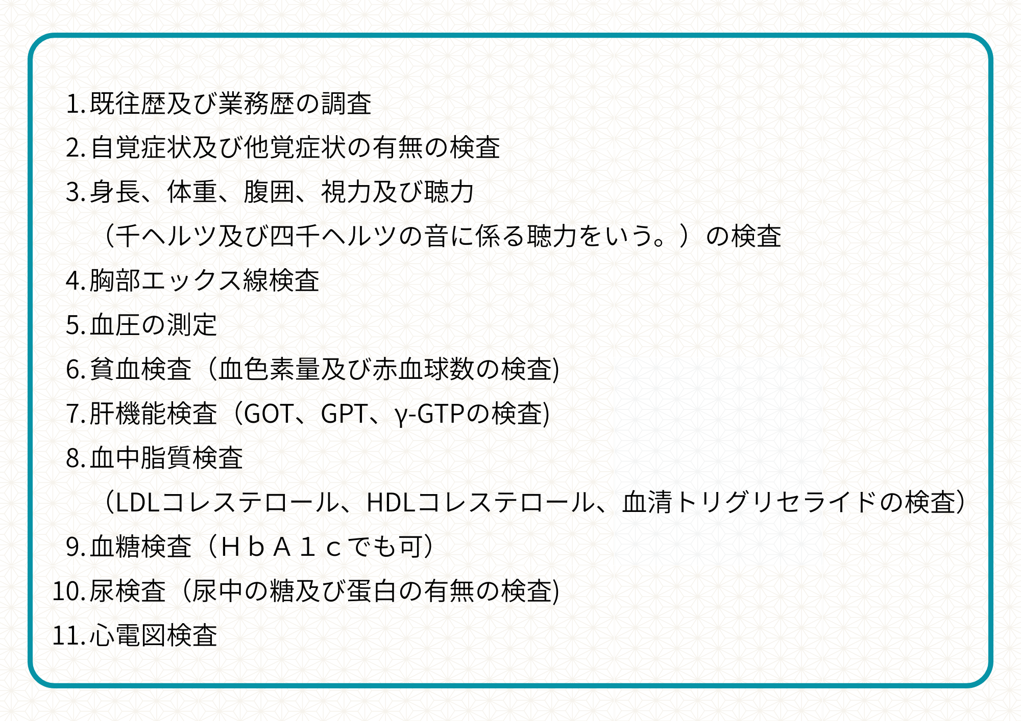 雇入時の健診項目は、労働安全衛生規則第43条で次のように定められています。